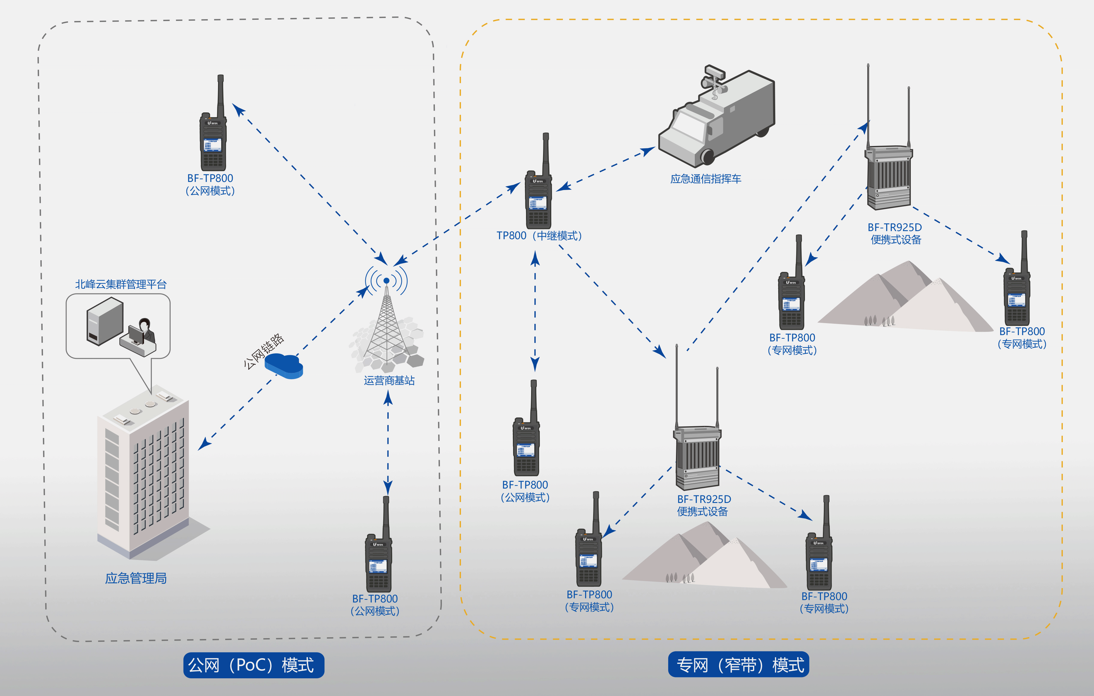 方案亮點 北峰BF-TP800公專融合對講機兼容專網(wǎng)、公網(wǎng)、公專混合、中繼4種通信模式,當(dāng)在公眾網(wǎng)絡(luò)良好環(huán)境下執(zhí)行任務(wù)時,依托公眾網(wǎng)絡(luò)信號,僅開啟公網(wǎng)模式,即可實現(xiàn)實時通訊、跨組互通及集群對講。當(dāng)需要進入偏遠(yuǎn)林區(qū)、山區(qū)、村鎮(zhèn)等沒有公網(wǎng)信號環(huán)境中或涉及到跨市跨部門聯(lián)合執(zhí)法時,不同終端對講機要進行跨網(wǎng)互通需求,只需采用BF-TP800中繼模式即可實現(xiàn)公網(wǎng)與專網(wǎng)互通。