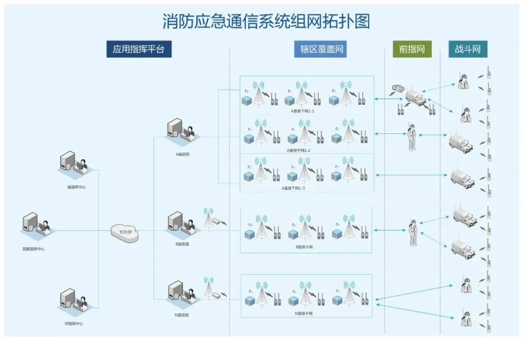 圖 城市消防應(yīng)急通信系統(tǒng)通過多手段保障通信拓?fù)?/strong> 北峰城市消防應(yīng)急通信系統(tǒng)運(yùn)用了IP互聯(lián)技術(shù)、同頻同播技術(shù)、窄帶自組網(wǎng)技術(shù)、寬帶自組網(wǎng)技術(shù)、北斗短報文技術(shù),通過網(wǎng)格化大區(qū)制靈活組網(wǎng)設(shè)計(jì)方案,實(shí)現(xiàn)全區(qū)全網(wǎng)廣域覆蓋,各級建制單位既可獨(dú)立成網(wǎng)使業(yè)務(wù)層層分流,又可互聯(lián)互通組成一張大網(wǎng)使信息資源和任務(wù)交互共享。 (中國集群通信網(wǎng) | 責(zé)任編輯:李俊勇) |