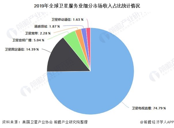 從全球衛(wèi)星服務(wù)業(yè)務(wù)收入構(gòu)成來看,主要來自衛(wèi)星電視直播和衛(wèi)星固定通信,兩者收入合計占衛(wèi)星服務(wù)業(yè)收入的比重接近90%。其中,衛(wèi)星電視直播收入為920 億美元,比上年減少2%;衛(wèi)星廣播收入為62 億美元,較上年增長7%;衛(wèi)星固定通信業(yè)務(wù)收入為177 億美元,較上年減少1%;衛(wèi)星移動通信收入為20 億美元,比上年減少51%。 在技術(shù)創(chuàng)新的推動下,衛(wèi)星寬帶收入和衛(wèi)星遙感收入均呈現(xiàn)出兩位數(shù)增長:衛(wèi)星寬帶收入增長了19%,達(dá)到28億美元,衛(wèi)星遙感收入增長了11%,達(dá)到23 億美元。