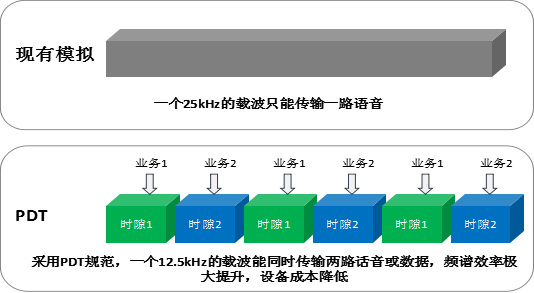 PDT標(biāo)準(zhǔn)采用先進(jìn)的數(shù)字語(yǔ)音壓縮技術(shù),相對(duì)于現(xiàn)有的模擬技術(shù),具有語(yǔ)音清晰、頻譜效率高、通信距離遠(yuǎn)、抗干擾能力強(qiáng)、安全、省電和支持?jǐn)?shù)據(jù)業(yè)務(wù)等優(yōu)點(diǎn),并支持?jǐn)?shù)模兼容,能有效滿足公共安全、市政、消防等專業(yè)用戶的無(wú)線通信應(yīng)用需求。 二、PDT數(shù)字集群系統(tǒng)優(yōu)勢(shì)①高頻譜效率,提升系統(tǒng)容量 PDT采用TDMA時(shí)分多址技術(shù),在12.5kHz載波帶寬上,一幀支持兩個(gè)時(shí)隙,可以同時(shí)支持2路通話,相對(duì)于12.5kHz帶寬的模擬系統(tǒng),容量提升了2倍,相對(duì)于25kHz帶寬的模擬系統(tǒng),容量提升了4倍。