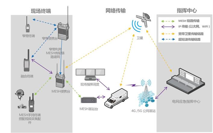 應(yīng)急通信是電網(wǎng)應(yīng)急救災(zāi)工作順利進(jìn)行的“鋪路石”。在遭遇突發(fā)災(zāi)害和事故時(shí),既可以為指揮調(diào)度提供通信保障,還可以為災(zāi)區(qū)群眾提供語音、視頻、圖像、短信等多元通信業(yè)務(wù)。北峰電網(wǎng)應(yīng)急空天一體化通信系統(tǒng)方案,在救災(zāi)工作中又是如何發(fā)揮作用? 三、設(shè)計(jì)方案 北峰電網(wǎng)應(yīng)急空天一體化通信系統(tǒng)方案的設(shè)計(jì)理念是:通過MESH自組網(wǎng)設(shè)備、窄帶中繼設(shè)備及傳輸通信設(shè)備的應(yīng)用,實(shí)現(xiàn)一個(gè)完善的電力應(yīng)急通信系統(tǒng),提供較大的傳輸帶寬和一定的無線覆蓋范圍,滿足廣西電網(wǎng)突發(fā)應(yīng)急和日常巡檢等不同場(chǎng)景下的音視頻和部分?jǐn)?shù)據(jù)業(yè)務(wù)傳輸需求,實(shí)現(xiàn)電力搶修的快速、安全。