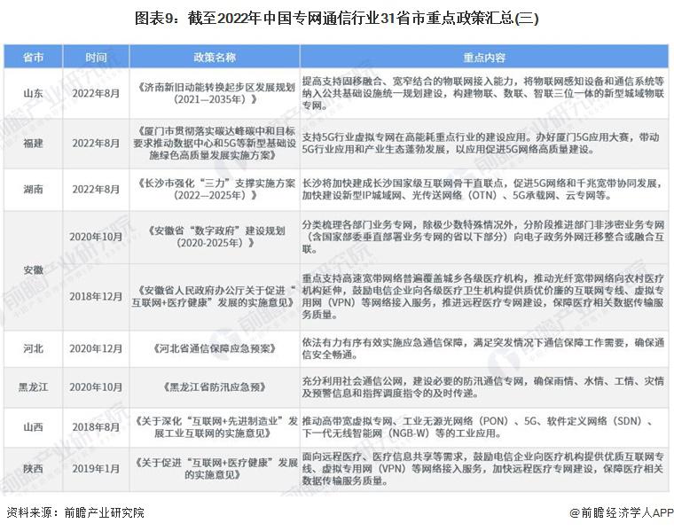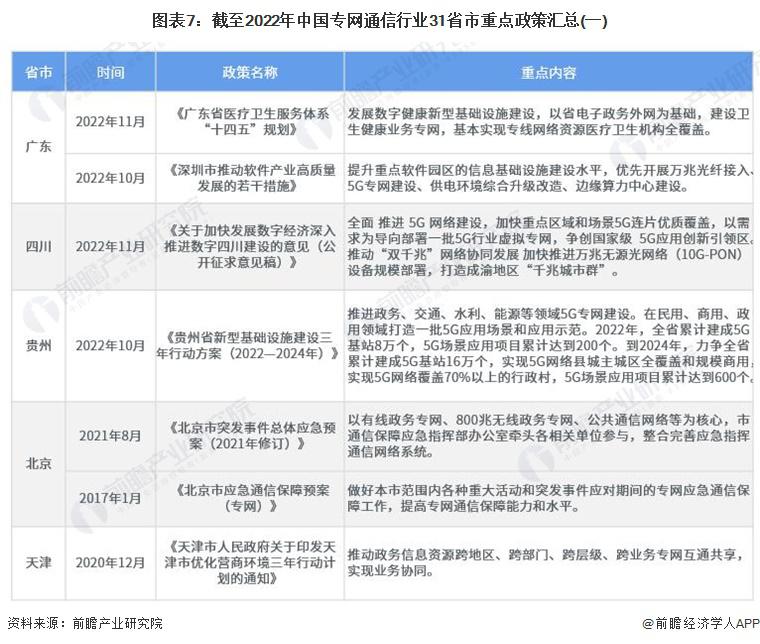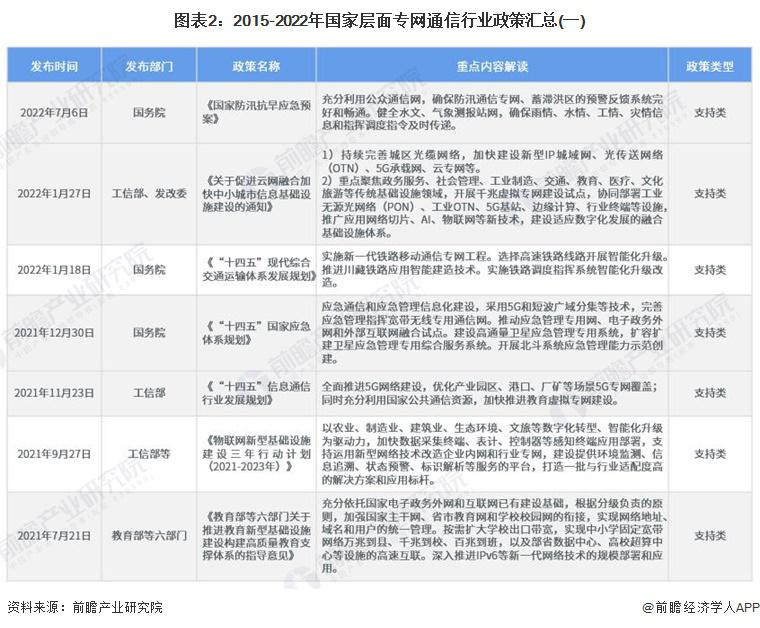主頁(yè)(http://www.www.xzhtuan.com):重磅!2023年中國(guó)及31省市專網(wǎng)通信行業(yè)政策匯總及解讀(全)政策 行業(yè)主要上市公司:中國(guó)電信 ( 00728 ) 、中國(guó)聯(lián)通 ( 600050 ) 、中國(guó)移動(dòng) ( 00941 ) 、海能達(dá) ( 002583 ) 、海格通信 ( 002465 ) 、烽火電子 ( 000561 ) 等 本文核心數(shù)據(jù):國(guó)家層面專網(wǎng)通信行業(yè)政策匯總 ; 地方層面專網(wǎng)通信行業(yè)政策匯總 ; 國(guó)家層面專網(wǎng)通信行業(yè)發(fā)展目標(biāo)解讀 1、政策歷程圖 我國(guó)專網(wǎng)通信相關(guān)政策,隨專網(wǎng)通信產(chǎn)業(yè)下游應(yīng)用的發(fā)展而發(fā)展。2018 年以前,專網(wǎng)通信政策主要集中于應(yīng)急通信與公共安全領(lǐng)域。2017 年出臺(tái)的《國(guó)家突發(fā)事件應(yīng)急體系建設(shè) " 十三五 " 規(guī)劃》強(qiáng)調(diào)加強(qiáng)衛(wèi)星應(yīng)急專網(wǎng)的統(tǒng)籌規(guī)劃,加快城市寬帶數(shù)字集群專網(wǎng)系統(tǒng)建設(shè),提高國(guó)家應(yīng)急通信保障能力!豆部萍紕(chuàng)新 " 十三五 " 專項(xiàng)規(guī)劃》中強(qiáng)調(diào)研發(fā)新型智能裝備,提高防控打擊綜合能力,并且加強(qiáng)對(duì)警務(wù)指揮通信等技術(shù)裝備的研發(fā)。 2018-2019 年,隨著互聯(lián)網(wǎng)教育的興起,教育專網(wǎng)的發(fā)展提上日程。2019 年,發(fā)改委發(fā)布《關(guān)于促進(jìn) " 互聯(lián)網(wǎng) + 社會(huì)服務(wù) " 發(fā)展的意見(jiàn)》,強(qiáng)調(diào)實(shí)施學(xué)校聯(lián)網(wǎng)攻堅(jiān)行動(dòng),加快建設(shè)教育專網(wǎng),實(shí)現(xiàn)所有學(xué)校接入快速穩(wěn)定的互聯(lián)網(wǎng)。根據(jù)《" 十四五 " 信息通信行業(yè)發(fā)展規(guī)劃》,全面推進(jìn) 5G 網(wǎng)絡(luò)建設(shè),優(yōu)化產(chǎn)業(yè)園區(qū)、港口、廠礦等場(chǎng)景 5G 專網(wǎng)覆蓋 ; 同時(shí)充分利用國(guó)家公共通信資源,加快推進(jìn)教育虛擬專網(wǎng)建設(shè)。