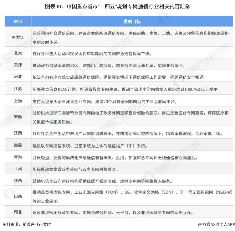 —— 31 省市專網(wǎng)通信行業(yè)發(fā)展目標(biāo)解讀 " 十四五 " 期間各省市發(fā)布的專網(wǎng)通信相關(guān)規(guī)劃主要集中于應(yīng)急通信、政府專網(wǎng)、工業(yè)互聯(lián)網(wǎng)、教育專網(wǎng)、醫(yī)療專網(wǎng)等方面。黑龍江、北京、河北、青海等省市相關(guān)規(guī)劃主要聚焦于應(yīng)急通信方向,天津、安徽、湖北、甘肅等省市相關(guān)政策規(guī)劃主要應(yīng)用在政府專網(wǎng)方向。