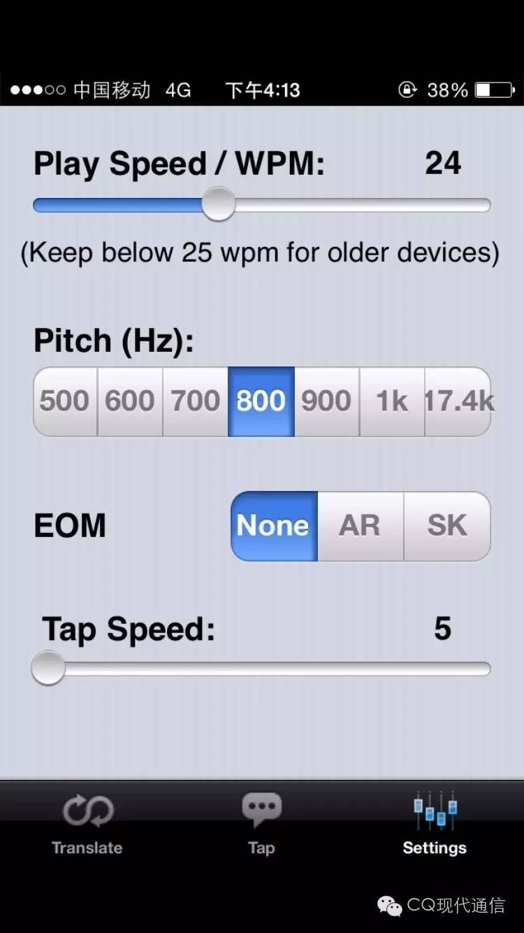 如圖所示,我自己通過(guò)點(diǎn)擊屏幕,長(zhǎng)短決定了嘀嗒/點(diǎn)劃。屏幕上方自動(dòng)顯示出相對(duì)應(yīng)的SOS的文本內(nèi)容。 在Tap Here to begin區(qū)域使用手指點(diǎn)擊,長(zhǎng)短,快慢自己把控,即可使用超便攜發(fā)報(bào)及譯碼裝置啦。(這個(gè)是不是比幾百塊的摩爾斯電碼練習(xí)工具更牛???LoL) 點(diǎn)擊Start Over 清除屏幕所有內(nèi)容。 軟件設(shè)置 通過(guò)這個(gè)項(xiàng)目能夠調(diào)整播放速度、聲音、步調(diào)、速率等內(nèi)容。隨時(shí)調(diào)整收發(fā)速度,個(gè)人定制練習(xí)方案。