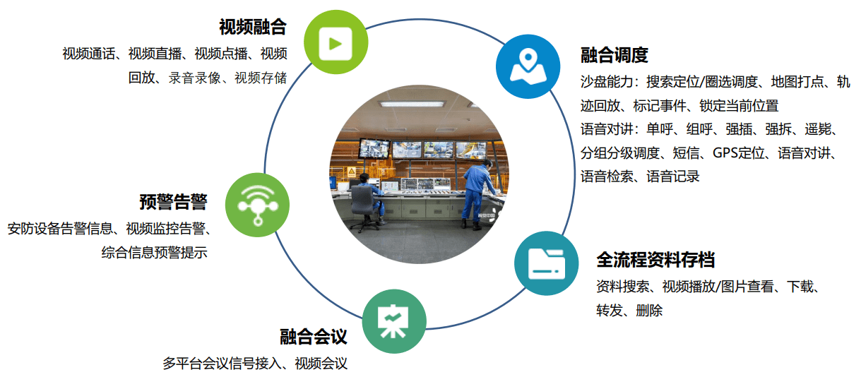 涵蓋多融合調(diào)度系統(tǒng)能力 融合調(diào)度: 支持視頻調(diào)度場景、GIS場景等界面同步呈現(xiàn)至大屏,實(shí)現(xiàn)直觀高效的調(diào)度指揮工作;支持報警點(diǎn)周邊資源展示(設(shè)備、圖像、視頻、設(shè)施);支持Windows、Android平臺,即時消息、語音、視頻、上傳并分發(fā);支持省、市、縣多級組網(wǎng);GIS位置服務(wù):實(shí)時位置查詢、歷史軌跡回放、電子圍欄、監(jiān)控。 語音調(diào)度: 支持語音對講,(基于框選或套繩位置信息的)臨時組呼、動態(tài)建組、強(qiáng)插、強(qiáng)拆、遙斃、掛機(jī)、呼叫轉(zhuǎn)移、通訊錄、呼叫列表、用戶狀態(tài)。 融合視頻: 支持視頻上傳、視頻分發(fā)/轉(zhuǎn)發(fā);實(shí)時視頻監(jiān)控、語音對講/廣播;視頻查看、調(diào)度,點(diǎn)對點(diǎn)視頻通話;對接入的監(jiān)控設(shè)備進(jìn)行操作。 融合會議: 支持調(diào)度臺直接發(fā)起多點(diǎn)決策會議;支持多畫面及分屏切換;支持控制會議模式(全雙工、半雙工通信),保證指令的傳達(dá);支持多編碼協(xié)議、多碼率、多分辨率的自適應(yīng)轉(zhuǎn)碼;支持會議白板等輔助工具。 歷史記錄: 支持終端信息上報查看、檢索;錄像檢索、錄像回放;視頻圖像點(diǎn)播、轉(zhuǎn)發(fā)、多畫面推送。