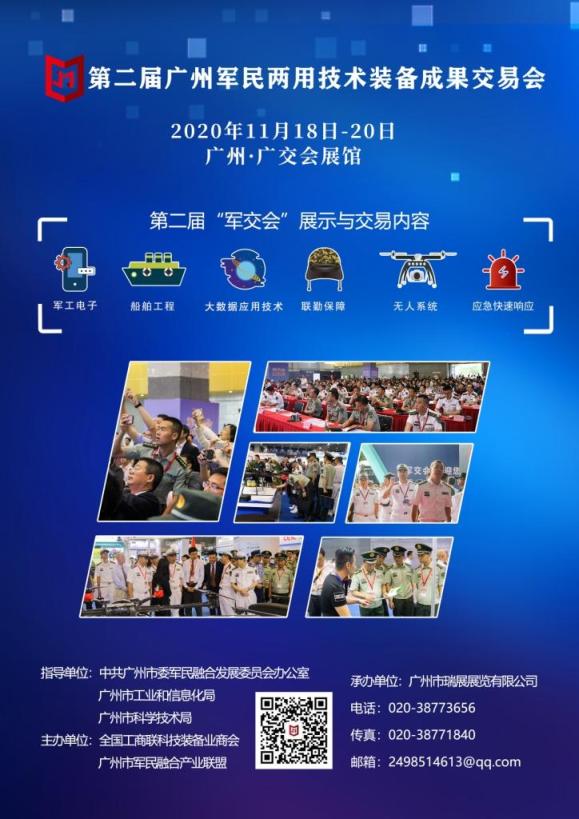 第二屆“軍交會”將于2020年11月18-20日在廣交會展館舉辦。本屆“軍交會”將聚焦軍工電子、船舶工程、大數(shù)據(jù)技術、聯(lián)勤保障及無人系統(tǒng)等五大領域,促進軍民兩用技術深度發(fā)展和雙向轉化,搭建供需雙方精準對接的交易平臺。 “軍交會”以軍方需求為導向,集中展示“民