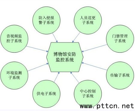 圖1 而從博物館安防監(jiān)控系統(tǒng)的實(shí)際需求來(lái)看,整個(gè)系統(tǒng)應(yīng)包括音視頻監(jiān)控子系統(tǒng)、防入侵報(bào)警子系統(tǒng)、人員巡更子系統(tǒng)、門禁管理子系統(tǒng)、傳輸子系統(tǒng)、中心控制子 系統(tǒng)、供電子系統(tǒng)、環(huán)境監(jiān)測(cè)子系統(tǒng)等。