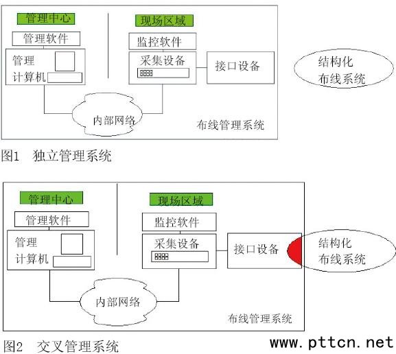 在一個工程中,永久鏈路電纜的平均長度通常為40~52米,它是最容易受到干擾的部分,同時,也是工程量最大的部分。水平電纜的敷設過程,對電纜橋架、環(huán)境溫度、彎曲半徑和路由中的干擾等諸多方面,都提出了更高的要求。 由于垂直電纜的敷設,通常在弱電豎井中進行,電纜橋架都是專用的通道,施工工藝相對簡單。 數(shù)據(jù)中心中的布線系統(tǒng),最大的特點是密度高,速度快,并且要考慮到變更的需求。針對這些新的要求,ModLink和iPass可以解決。ModLink和iPass的主導思想是預端接,預測試。這包括兩個方面:ModLink、iPass模塊內部的連接,及兩個Modlink、iPass模塊之間的連接。Modlink內部的連接是指MPO/MTP和面板上的LC等光纖連接器的連接。iPass內部的連接是指iPass連接器和RJ45插座間的連接。兩個模塊之間的電纜或光纜,由Molex根據(jù)用戶的要求進行定制。由于模塊內部連接和模塊之間的連接是在工廠內完成的,因此,所有的環(huán)節(jié)都是可以測試的。 采用ModLink和iPass解決方案后,大大的節(jié)約了安裝空間,提高了安裝速度。更重要的是,由于密度的提高和交聯(lián)電纜、光纜的集中封裝,管理工作變得容易起來,并方便了數(shù)據(jù)中心節(jié)點的移動、增加、修改等日常操作。 第二代實時布線管理系統(tǒng) 管理中心分為軟件和硬件兩大部分。硬件部分為管理計算機;管理軟件運行在管理計算機上,軟件部分為操作系統(tǒng)和布線管理軟件,軟件架構可以采用C/S或B/S模式。 現(xiàn)場區(qū)域分為監(jiān)控軟件、采集設備和接口設備三大部分。監(jiān)控軟件運行在現(xiàn)場信息采集設備中,采集設備一般采用嵌入式操作系統(tǒng)或更加低級的方式;接口設備完成管理系統(tǒng)和結構化布線系統(tǒng)的耦合。 管理軟件和監(jiān)控軟件以硬件為支撐,通過通信網絡交換信息。根據(jù)布線管理系統(tǒng)和結構化布線系統(tǒng)耦合程度的強弱,可以將其分為獨立管理系統(tǒng)和交叉管理系統(tǒng)兩種模式,如圖1、2所示。 |