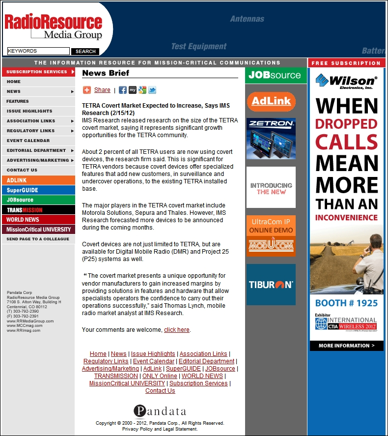 主頁(http://www.www.xzhtuan.com):《RadioResource》:IMS Research表示TETRA隱藏式終端市場將增加 近日,IMS Research發(fā)布了TETRA隱藏式終端市場規(guī)模的研究,研究顯示在TETRA用戶中約2%的用戶正在使用隱藏式設備,且用戶數(shù)量將呈現(xiàn)持續(xù)增長的趨勢。這對TETRA供應商意義重大。同時,隱藏式設備并不僅僅局限于TETRA標準,還能滿足數(shù)字移動無線電(DMR)和P25以及系統(tǒng)產品等存在需求。
