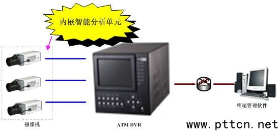 方式3:通過對ATM監(jiān)控系統(tǒng)中的攝像機加載智能視頻處理模塊,形成智能視頻處理攝像機。這樣在不改變傳統(tǒng)ATM監(jiān)控系統(tǒng)連接方式的前提下,智能視頻處理攝像機能夠?qū)ζ洳东@的視頻數(shù)據(jù)進行智能分析處理。