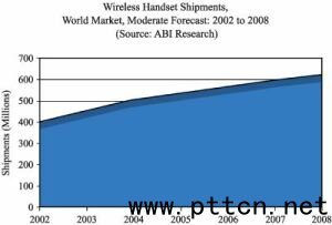 ABI預測,2005年全球手機銷量將達到5.4億部,將POC集成到手機的標準系統(tǒng)中將有效增加平均每用戶費用(ARPU)。另外,作為手機的標準屬性,POC可能最終將突破美洲市場,據(jù)悉全球有20多家運營商正在考慮將PPOC服務增加到網(wǎng)絡中。