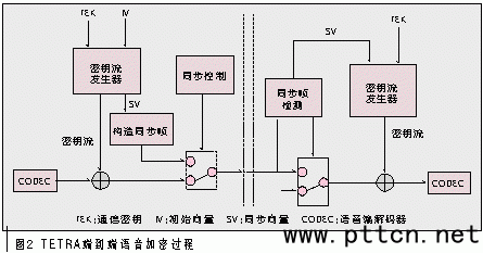 具體的端到端語(yǔ)音加密的過(guò)程如圖2所示。圖2中虛線左側(cè)是發(fā)送移動(dòng)臺(tái)的加密過(guò)程,右側(cè)是接收移動(dòng)臺(tái)的解密過(guò)程。語(yǔ)音數(shù)據(jù)加密算法有通信密鑰和初始向量?jī)蓚(gè)輸入,生成一個(gè)連續(xù)的密鑰流,該密鑰流與語(yǔ)音編解碼器(CODEC)輸出的語(yǔ)音數(shù)據(jù)流異或后得到在TETRA系統(tǒng)中傳輸?shù)募用苷Z(yǔ)音。為了讓接收移動(dòng)臺(tái)能夠正確解密加密后的語(yǔ)音,同步初始向量被加入到數(shù)據(jù)流中。與發(fā)送端正好相反,接收端檢測(cè)到同步幀,取出同步幀中的同步向量,將該向量傳給本地的密鑰流產(chǎn)生器,從而完成與發(fā)送端的同步。