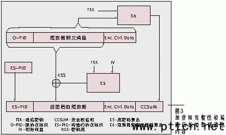 如同在GSM系統(tǒng)中一樣,TETRA系統(tǒng)也支持SDS,短數(shù)據(jù)消息可以是用戶自定義的消息或是狀態(tài)報(bào)告(狀態(tài)報(bào)告是預(yù)定義的消息)。TETRA系統(tǒng)所定義的SDS類型Ⅳ可發(fā)送最多達(dá)2 047不定長(zhǎng)位的短數(shù)據(jù)。進(jìn)行加密和完整性校驗(yàn)前后的短數(shù)據(jù)消息內(nèi)容如圖3所示。