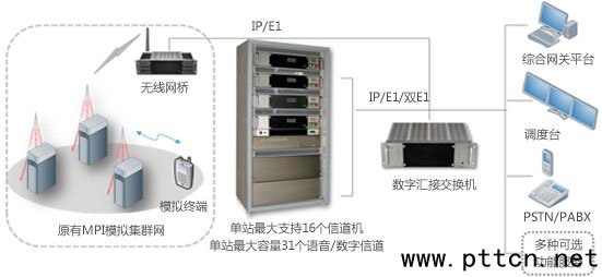 在規(guī)劃建設(shè)區(qū)域,拆除原有模擬基站,直接新建PDT數(shù)字系統(tǒng),同時(shí)可以將拆除的原有模擬基站搬遷到二線(xiàn)地區(qū)使用,保護(hù)原有基站設(shè)備的投資。新建的PDT數(shù)字集群網(wǎng)絡(luò)和遺留的模擬集群網(wǎng)絡(luò)通過(guò)標(biāo)準(zhǔn)的PDT-MPT無(wú)線(xiàn)網(wǎng)關(guān)設(shè)備互聯(lián)互通。