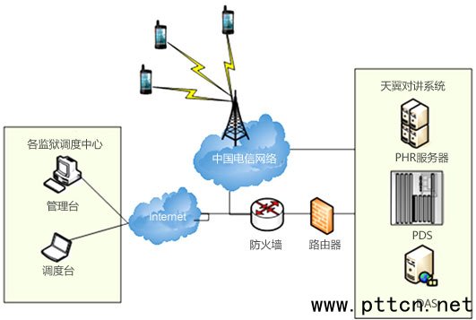 GoTa系統(tǒng)可以依托電信網(wǎng)絡(luò),購(gòu)機(jī)入電信網(wǎng),全省監(jiān)獄通過(guò)寬帶接入電信GoTa天翼對(duì)講系統(tǒng)。中國(guó)電信為監(jiān)獄分配集團(tuán)管理員帳號(hào),只有監(jiān)獄管理員可以通過(guò)管理臺(tái)管理本集團(tuán)用戶,實(shí)現(xiàn)監(jiān)獄內(nèi)部的調(diào)度管理。
