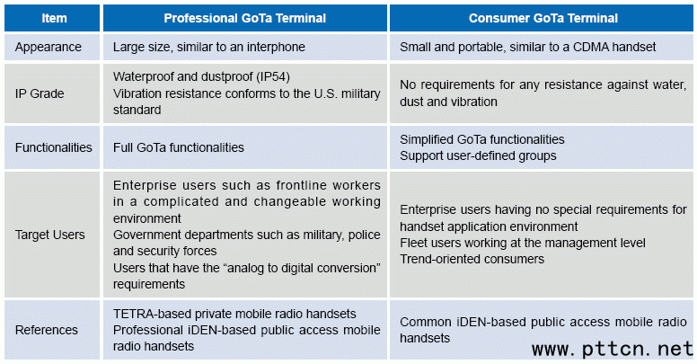 Consumer GoTa terminals are designed for professional trunking users working at the management level, enterprises and public institutions that have no special requirements for handset application environment, service industry including restaurants and hotels, and fashion-seeking youngsters. These users occasionally or often use their handset terminals for professional trunking services in addition to general voice communications, but they have no strict requirements for the application environment.
