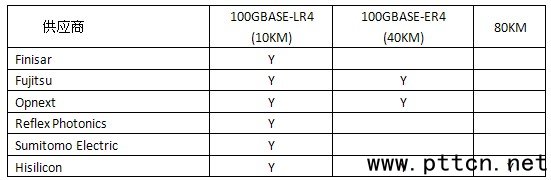 從產(chǎn)業(yè)鏈的角度來看,100GE技術(shù)已經(jīng)在路由器、波分產(chǎn)品上廣泛應(yīng)用,PTN與波分、路由器三大產(chǎn)品共享100GE產(chǎn)業(yè)鏈。從2011年開始,F(xiàn)inisar、Fujitsu、華為Hisilicon等廠家就能提供標(biāo)準(zhǔn)化的10KM的100GE CFP模塊,并于2013年和2014年分別推出了40KM和80KM模塊。2014年,中國移動集采測試了100GE 80KM方案,標(biāo)志著100GE長距離解決方案成熟。 當(dāng)前各廠家100GE光模塊提供能力: