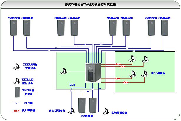 西安地鐵2號線1期工程于2011年9月16日開通試運營。線路全長25公里,共包含21個車站。該線路無線列調(diào)系統(tǒng)采用摩托羅拉全套TETRA數(shù)字集群通信系統(tǒng)解決方案,包括交換控制中心、基站、調(diào)度臺、固定臺、車載臺和手持終端。TETRA無線列調(diào)系統(tǒng)既為常態(tài)列調(diào)和各單位間聯(lián)絡(luò)使用,又兼顧應(yīng)對突發(fā)事件 摩托羅拉TETRA系統(tǒng)(產(chǎn)品名稱Dimetra IP)的內(nèi)部數(shù)據(jù)交換和控制基于IP軟交換平臺。由于采用了最先進的成熟可靠的IP核心網(wǎng)絡(luò),Dimetra IP系統(tǒng)可靠性高,具備平滑的擴容能力,可隨城市軌道交通各條線路建設(shè)逐步模塊化擴容。Dimetra IP可按照城市軌道交通各線路的調(diào)度和管理體系劃分話音和數(shù)據(jù)虛擬專網(wǎng)(VPN),為不同線路列調(diào)和管理適度保持獨立性提供了安全保證。 2、西安地鐵2號線無線列調(diào)系統(tǒng)結(jié)構(gòu) 西安地鐵2號線TETRA無線列調(diào)系統(tǒng)包括1套交換控制中心(MSO),23個雙載頻基站,6個調(diào)度臺,1個網(wǎng)絡(luò)管理終端,23個車站固定電臺,44個機車車載電臺和若干手持臺組成,系統(tǒng)框圖如圖1所示。