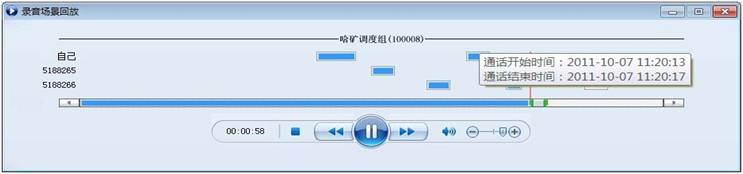4.通話錄音 錄音功能是調(diào)度工作總結(jié)和事故排除的一個利器,內(nèi)蒙古神華準(zhǔn)格爾能源有限責(zé)任公司非常明確的提出此功能的重要性,要求能夠原聲錄音,且必須保證不小于半年的存儲。 摩托羅拉的車臺可以輸入、輸出775mVRMS的模擬聲音。根據(jù)這一特點,我們開發(fā)了專門的硬件設(shè)備,外置的數(shù)字音頻板。 數(shù)字音頻板用于采集摩托羅拉車臺的模擬輸入輸出信號,為能夠使輸入輸出音頻達(dá)到一致性,信號經(jīng)由DSP數(shù)字音頻處理,經(jīng)過音頻增益、降噪、硬編碼、壓縮,在保證最好音質(zhì)基礎(chǔ)上保持文件的最小存儲,使每秒聲音文件大小不到10KB。 并且,我們?yōu)槠涮峁┝藢iT的錄音回放播放器。它不但能夠?qū)我坏匿浺暨M(jìn)行指定播放,結(jié)合煤田實際調(diào)度工作,又加入了基于事件回放能力的場景錄音回放,用以還原某時間段內(nèi)的通話過程,此項功能使客戶在調(diào)度會議總結(jié)工作中,最大限度發(fā)揮了錄音功能的優(yōu)勢,用戶對此項功能提出了認(rèn)可與贊揚。