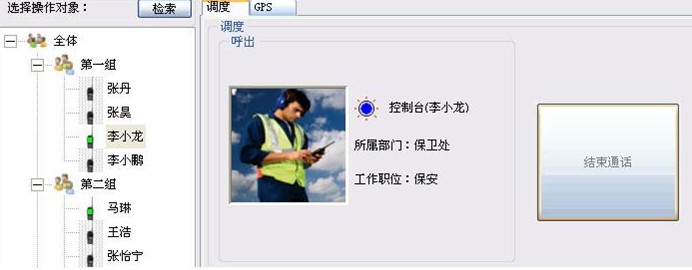 如上圖所示,界面左側樹形結構是操作對象列表,右側是操作界面,可以進行指揮調度和GPS信息定位操作。程序啟動后默認處于調度操作界面,單擊界面上側的【GPS】選項卡可切換到GPS定位界面。
