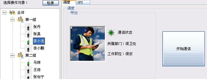 選擇呼叫對象,界面右側的“呼出” 顯示區(qū)域會顯示該對象的信息,如下圖所示。將鼠標移到“開始通話”按鈕上方,按下左鍵,即可實現對該對象的呼叫。通過選擇單個成員、組成員或全體成員,可以實現個體呼叫、組呼和全呼功能。