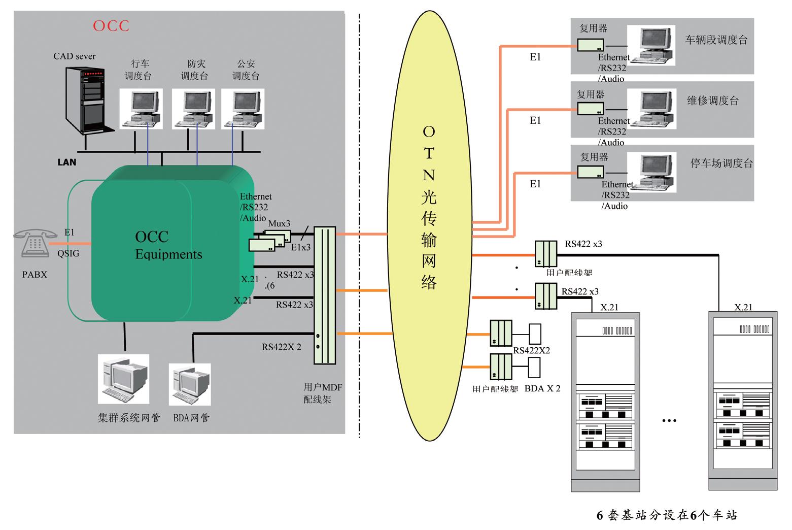 2、整個(gè)系統(tǒng)配置一套交換控制中心設(shè)備,6個(gè)基站(其中2+1載頻4個(gè),1+1載頻2個(gè)),6套調(diào)度臺(tái),1套網(wǎng)管設(shè)備(含集群網(wǎng)管和直放站網(wǎng)管)。遠(yuǎn)端基站及調(diào)度臺(tái)經(jīng)由光通道連接至交換控制中心。基站與交換控制設(shè)備的連接接口為X.21,通過(guò)客戶(hù)OTN提供的E1鏈路或隨路RS422連接到OCC。