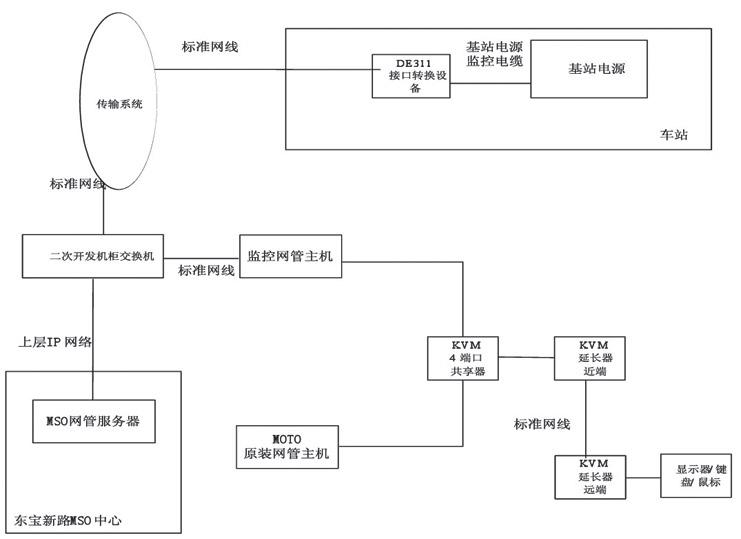 網(wǎng)管監(jiān)控流程:各車站DE311接口轉(zhuǎn)換設(shè)備的作用是將基站電源的信息用RS232接口轉(zhuǎn)換成IP接口,通過傳輸系統(tǒng),再經(jīng)過二次開發(fā)機(jī)柜內(nèi)交換機(jī),傳送至網(wǎng)管服務(wù)器,最后匯總到MSO網(wǎng)管服務(wù)器?刂浦行谋O(jiān)控網(wǎng)管主機(jī)與二次開發(fā)機(jī)柜內(nèi)交換機(jī)通過標(biāo)準(zhǔn)網(wǎng)線連接。 在監(jiān)控網(wǎng)管主機(jī)上安裝網(wǎng)管監(jiān)控底層軟件,該軟件通過IP接口監(jiān)控各車站側(cè)基站電源設(shè)備。該軟件還通過IP監(jiān)控各調(diào)度臺(tái)、CAD服務(wù)器、網(wǎng)管客戶端、錄音機(jī)的軟件開啟狀態(tài)。網(wǎng)管監(jiān)控底層軟件將監(jiān)控得到的信息寫入到MSO網(wǎng)管服務(wù)器的數(shù)據(jù)庫中。 在監(jiān)控網(wǎng)管主機(jī)上需安裝上海地鐵網(wǎng)管客戶端軟件,該軟件通過內(nèi)部協(xié)議從MSO網(wǎng)管服務(wù)器讀取數(shù)據(jù),并呈現(xiàn)在圖形化界面上。