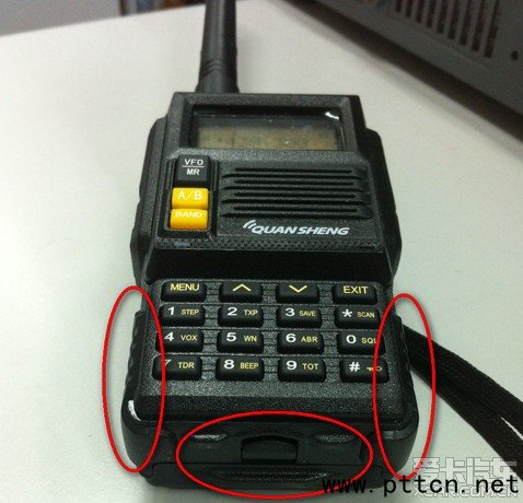 大氣、棱角分明、很野很爺們的感覺,有種變形金剛電影的那種金屬的美感,實際是塑料的,建議外包裝箱上增加變形金剛的背景圖片來襯托TG-45UV的這種陽剛之氣。設備上前后有防滑凸點,喇叭下方有“QUANSHENG”標識,標識無處不在,如面板、背夾、手繩,彰顯身份,手感舒適易把握,但整體稍大,略顯憨笨;設備下面有三個突起,用于這里放置時與桌面接觸,鍵盤兩側有兩塊防滑塑料,仿八重洲FT1DR,但非膠皮,個人感覺材質應該向八重洲FT1DR學習,此處的膠皮設計既可以防滑增加摩擦力又可以避免使用過程中的磕磕碰碰對設備外觀造成的不利影響,更有助于提升整體形象,而硬塑料感覺太冷,并且起不到保護作用,實為雞肋,有山寨感覺。