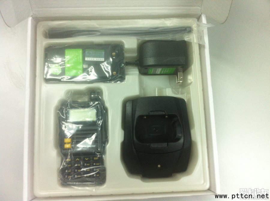 說明書放在上面,塑料內盒中依次擺放著主機、電池、天線、充電器和充電底座,整齊、牢靠。
