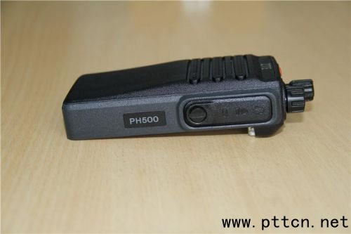 左側(cè)旋鈕為開關(guān)和音量大小調(diào)節(jié),右側(cè)旋鈕鍵可調(diào)換16個信道,左上角為LED指示器,右上角紅色按鈕為緊急鍵。此外,通過設(shè)置可將信道分成兩組,通過快捷按鍵切換,可將PH500信道容量提升至32個。