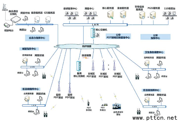 系統(tǒng)除提供PDT移動(dòng)臺(tái)語(yǔ)音通信外,還提供應(yīng)用接口(API)與省、市、區(qū)縣公安局指揮中心的警用地理信息系統(tǒng)(PGIS)和警用信息平臺(tái)進(jìn)行聯(lián)網(wǎng),實(shí)現(xiàn)可視化指揮調(diào)度應(yīng)用,滿足公安警力的各種調(diào)度指揮通信需求。 應(yīng)急數(shù)字集群(PDT)通信網(wǎng)結(jié)構(gòu)圖