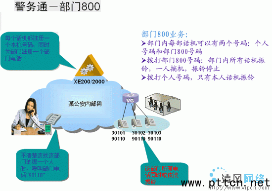 在公安系統(tǒng)內(nèi)部,可以為一些重要的執(zhí)勤部門設(shè)置部門800號碼,在撥打部門800號號碼時,部門內(nèi)的所有話機(jī)都進(jìn)行震鈴,當(dāng)一個任摘機(jī)后,所有震鈴?fù)V。這樣可以提高執(zhí)勤電話的接通率,提高部門的接警反應(yīng)速度。