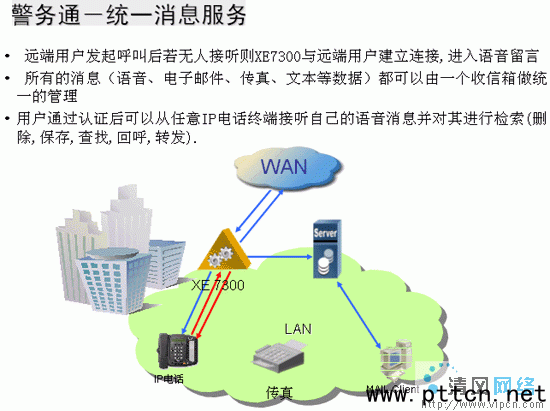 公安系統(tǒng)的人員經(jīng)常有外出執(zhí)行任務(wù)的情況,此時通常不能及時的接收到固定電話呼叫、郵件及傳真等不同類型的消息。通過統(tǒng)一消息服務(wù),在IP網(wǎng)絡(luò)上構(gòu)架統(tǒng)一消息服務(wù)器XE7300,將所有的消息(語音、電子郵件、傳真、文本)進(jìn)行統(tǒng)一的治理,使用者通過單一的終端設(shè)備,比如電話或PC,就能夠在任何時間、任何地點(diǎn)接收和取得不同來源的消息(如:聲音、傳真和電子郵件),從而簡化了通信手段。