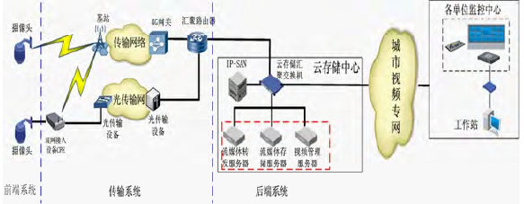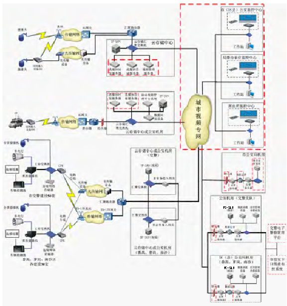 圖1:系統(tǒng)總體架構(gòu)圖 本項(xiàng)目建設(shè)新建高清視頻圖像采集系統(tǒng)、配套云存儲(chǔ)中心,并接入城市視頻專網(wǎng)。建設(shè)部分主要由前端系統(tǒng)、傳輸系統(tǒng)、后端存儲(chǔ)系統(tǒng)等組成。 總體組網(wǎng)結(jié)構(gòu)如下圖所示,見圖2。
