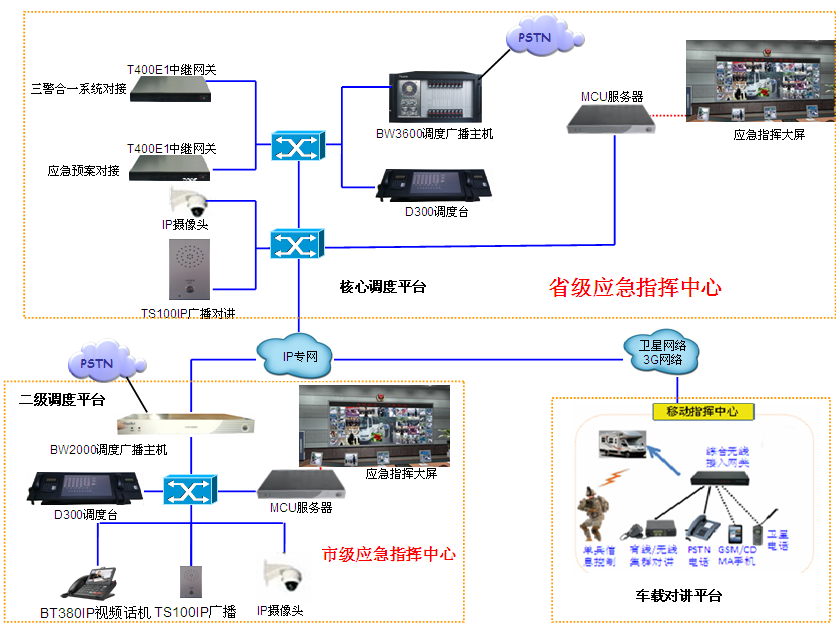 方案概述: 系統(tǒng)建設(shè)的思路是在基于政府部門的IP專網(wǎng)部署三級指揮中心(省應(yīng)急指揮中心、 市應(yīng)急指揮中心、移動應(yīng)急指揮中心)。本系統(tǒng)中省政府應(yīng)急指揮中心、市政府應(yīng)急指揮中心、 全市各級應(yīng)急部門之間已經(jīng)搭建好完善的政府專網(wǎng),因此多媒體融合調(diào)度平臺需完全基于政府專網(wǎng)部署, 無需進行復(fù)雜、重復(fù)的布線,且系統(tǒng)內(nèi)所有軟硬件設(shè)備均可安裝在政府專網(wǎng)覆蓋的任何地點,便于系統(tǒng)的靈活擴展。 系統(tǒng)內(nèi)各設(shè)備之間通過標(biāo)準(zhǔn)SIP信令交互信息。 系統(tǒng)提供豐富的PSTN/GSM/WCDMA/3G/衛(wèi)星等各種中繼接口連接各個運營商網(wǎng)絡(luò), 便于指揮人員緊急調(diào)度各部門內(nèi)線分機、公網(wǎng)座機、手機、小靈通等公網(wǎng)通信終端,同時便于領(lǐng)導(dǎo)通過手機、 家庭座機實現(xiàn)對現(xiàn)場救援人員的遠程指揮調(diào)度工作。 通過各級指揮中心的多媒體融合 MD-S綜合應(yīng)急調(diào)度廣播平臺整合各級政府部門內(nèi)部的辦公通信系統(tǒng)、有線調(diào)度系統(tǒng)、 集群對講系統(tǒng)、擴音廣播系統(tǒng)、視頻監(jiān)控系統(tǒng)、無線視頻采集系統(tǒng)、政府專用業(yè)務(wù)系統(tǒng)等系統(tǒng), 通過多媒體融合調(diào)度平臺實現(xiàn)不同通信系統(tǒng)的集中接入、統(tǒng)一調(diào)度、互通交互。 三、 藍海迅捷優(yōu)勢: 1. 指揮調(diào)度中心環(huán)境更加簡潔、實用。只需要通過一個調(diào)度界面即可實現(xiàn)對政府部門常用的各種有線 /無線語音、視頻終端的集中管理調(diào)度,不需要再通過多套平臺分別控制。 2. 應(yīng)急處置手段更加豐富、指揮調(diào)度過程更加便捷。在處突過程中所有的調(diào)度操作(單呼、會議、廣播、視頻等) 均可實現(xiàn)一鍵式操作,并可實時監(jiān)控人員/終端的工作狀態(tài), 真正做到按人員/崗位進行調(diào)度,而不是按號碼進行調(diào)度,領(lǐng)導(dǎo)只需要根據(jù)人員 /崗位的圖標(biāo)來進行指揮,無需記住任何號碼,也不用考慮通信終端類型。 3. 跨區(qū)域、跨部門、跨系統(tǒng)聯(lián)合作戰(zhàn)能力得到加強。不同部門、不同區(qū)域、 不同系統(tǒng)的通信終端之間可通過多媒體融合調(diào)度平臺實現(xiàn)無縫互通,確保在處突過程中不存在通信死角。 4. 處突過程現(xiàn)場通信保障手段更加靈活。可根據(jù)處突現(xiàn)場的環(huán)境選配最恰當(dāng)?shù)耐ㄐ沤K端類型, 如在固定值班區(qū)域配置有線的座機、監(jiān)控、TS100IP廣播;在野外處突時攜帶 3G單兵、無線圖傳單兵等。 5. 現(xiàn)場指揮調(diào)度能力更加有效。通過車載指揮調(diào)度平臺的配置,可在處突現(xiàn)場快速搭建臨時指揮平臺, 方便領(lǐng)導(dǎo)靠前指揮,可在車載指揮平臺上實現(xiàn)地面指揮中心的所有調(diào)度操作,并可實現(xiàn)車和地面指揮中心、 車和現(xiàn)場救援人員的無線調(diào)度。 (中國集群通信網(wǎng) | 責(zé)任編輯:陳曉亮) |