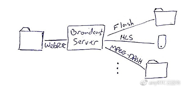 圖1 如何使用WebRTC來做直播? 通常推流端使用WebRTC將本地視頻上傳到流媒體服務器端,然后在服務端將WebRTC的流轉碼成RTMP,HLS,MPEG-DASH等,再通過傳統(tǒng)的流媒體通道進行直播分發(fā)。 這個架構還是借助傳統(tǒng)直播的方案,只是利用了WebRTC的特性將推流端到服務端之間的流傳進行優(yōu)化,這樣做的最大問題是服務端的性能消耗和直播分發(fā)的延時,我們知道類似HLS這樣的協(xié)議通常延時在15s+。 隨著應用場景對于實時性要求的提高,上面的架構無疑還是無法滿足需求的。通過anyrtc的運營數(shù)據(jù)和市場需求分析來看,更多的需求方希望看到更低延時的視頻流,以幫助他們完成更加豐富的場景需求。 而當前這種架構不能勝任實時直播的工作,因為在傳統(tǒng)直播架構中緩存,分片等設計方式保障了直播的流暢性,但是卻犧牲了直播的實時性。 WebRTC能做什么 由于傳統(tǒng)直播方案無法應對低延時直播場景,這就是為什么需要一個全新的直播架構,當然低延時和實時性是必需的。但是由于一個協(xié)議的標準化和實施需要很長時間,因此目前最佳的可選方案就是WebRTC,今年(2018年6月)WebRTC 1.0規(guī)范正式發(fā)布,各大廠商均表現(xiàn)出很高的積極性,而且現(xiàn)在大多數(shù)瀏覽器中已經原生支持,這對WebRTC未來更加廣泛的應用打下了非常夯實的基礎。