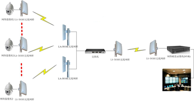 三、解決方法 按照要求在前端每臺網(wǎng)絡(luò)高清攝像機(jī)用一臺LA-5830S無線網(wǎng)橋作為發(fā)射,前端共需十二臺LA-5830S無線網(wǎng)橋作為發(fā)射。監(jiān)控中心用2臺LA-5810E無線網(wǎng)橋來接收。接收端收到信號后通過交換機(jī)把信號集中后再用一對LA-5830S來傳輸這十二臺網(wǎng)絡(luò)高清攝像機(jī)信號,后進(jìn)到數(shù)字矩陣或者硬盤錄像機(jī)(NVR)存儲顯示。