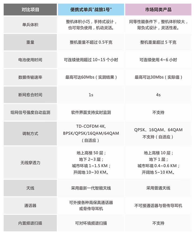 一、產(chǎn)品概況: 便攜式寬帶自組網(wǎng)單兵“戰(zhàn)狼1號(hào)”具備刷新行業(yè)水平的遠(yuǎn)距離傳輸能力,產(chǎn)品中配備的強(qiáng)大電臺(tái)具有波束成形、收發(fā)分集與空分復(fù)用能力,在可視環(huán)境,達(dá)到市場(chǎng)同類產(chǎn)品二倍以上的傳輸距離。本產(chǎn)品顯著應(yīng)用于非可視(NLOS)多徑衰落環(huán)境下的視頻 / 數(shù)據(jù) / 語(yǔ)音的關(guān)鍵通信。經(jīng)過(guò)多次實(shí)測(cè),其優(yōu)異的信號(hào)傳輸能力得到市場(chǎng)的充分肯定。