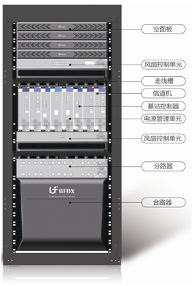 各區(qū)/縣級集群系統(tǒng)建設(shè)完成后,可接入地市級聯(lián)網(wǎng)中心、實現(xiàn)地級市系統(tǒng)互聯(lián)互通;地級市聯(lián)網(wǎng)中心匯接至省級聯(lián)網(wǎng)中心,形成區(qū)(縣)、市、省三級PDT/DMR網(wǎng)絡(luò)結(jié)構(gòu),省級單位、市級單位可直接管理到縣/區(qū)級PDT集群系統(tǒng)。實現(xiàn)全省應(yīng)急聯(lián)動指揮網(wǎng),同樣在智慧城市中可實現(xiàn)不同單位和部門的PDT/DMR集群連接到地級市指揮中心。 五、系統(tǒng)組成介紹 BF-9500 PDT警用系統(tǒng)基站 BF-9500基站采用單元模塊化的設(shè)計理念,擁有極高的可靠性和可擴展性以及強大豐富的業(yè)務(wù)功能。支持多級故障弱化模式,基站能獨立處理站內(nèi)呼叫,有效提高產(chǎn)品的可靠性和效率。實現(xiàn)關(guān)鍵硬件設(shè)備部件采用備份機制,如基站控制器備份,集群主控信道備份、網(wǎng)元鏈路備份等。