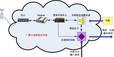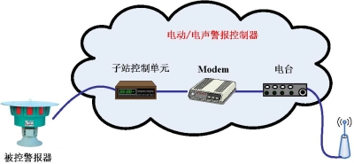 子站由電動/電聲警報控制器及電源等組成。其中電動/電聲警報控制器由無線電臺、無線Modem、子站控制單元、天/饋線組成。子站控制電動、電聲警報器發(fā)放各種警報并收集信息回饋中心。子站的組成原理如圖三所示,電動/電聲警報控制器設備如圖四所示。