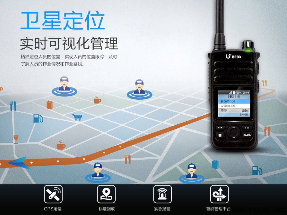 實(shí)時(shí)在線,GPS精準(zhǔn)定位 BF-CM628內(nèi)置全球GPS衛(wèi)星定位模塊,方便調(diào)度人員在指揮中心通過電子地圖和調(diào)度界面,清楚地了解每個(gè)人員的實(shí)時(shí)位置及動(dòng)態(tài)信息;實(shí)時(shí)記錄人員運(yùn)動(dòng)軌跡,并隨時(shí)調(diào)取歷史軌跡進(jìn)行回放與查詢,輕松自如地指揮人員,最大限度提高不同崗位人員調(diào)度與管理效率。