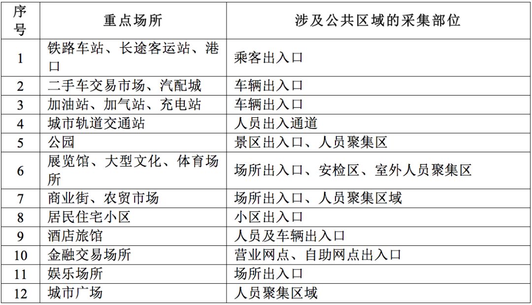 重點單位的特點:一是大多數單位的圍合程度較高,出入口較為集中;二是進出各單位的主體為車輛和人員。因此在重點單位場景下布設視頻監(jiān)控需覆蓋單位出入口區(qū)域,以掌握出入口處的車輛人員通過情況。 04 重點場所 重點場所包括鐵路車站、長途汽車客運站、二手車交易市場、汽配城、加油站、加氣站、充電站、城市軌道交通站、公園、體育館、商業(yè)街、農貿市場、居民住宅區(qū)、酒店旅館,金融交易場所、文化宗教場所、娛樂場所等,以及市民廣場、紀念性廣場、生活廣場等城市廣場。重點場所涉及公共區(qū)域的采集部位如下表所示。