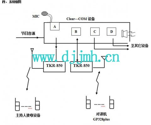 主頁(http://www.www.xzhtuan.com):電視臺轉(zhuǎn)播車無線對講系統(tǒng) 一、概述: 1、 無線通訊系統(tǒng)因具有可移動性,在電視行業(yè)的節(jié)目制作或現(xiàn)場直播工作中,無線通訊系統(tǒng)結(jié)合通話系統(tǒng)會給其帶來靈活機動、事辦功倍的作用。 2、 無線通訊系統(tǒng)與電視行業(yè)中通話系統(tǒng)結(jié)合,稱之為無線導(dǎo)播系統(tǒng),經(jīng)CCTV、天津電視臺、重慶電視臺、廣州電視臺、浙江電視臺、山東電視臺、吉林電視臺、河南電視臺等眾多新聞媒體的廣泛使用,反映良好,不斷地在增容擴展。 3、 無線導(dǎo)播系統(tǒng)與通話系統(tǒng)在通話的功能上是相同的,準(zhǔn)確地說無線導(dǎo)播系統(tǒng)是在通話系統(tǒng)基礎(chǔ)上的無線延伸。 4、 無線導(dǎo)播系統(tǒng)大小規(guī)模,取決于無線通道的路數(shù)以及無線終端的數(shù)量。從電視節(jié)目制作行業(yè)職能分工而言,主要有導(dǎo)演、分導(dǎo)演、主持人、攝像、微波、音響、燈光、劇務(wù)等,但無線導(dǎo)播系統(tǒng)受到占用頻率的限制,以及設(shè)備體積和費用等方面的限制,不可能詳細按上述職能分配相應(yīng)的無線通道。通常將關(guān)鍵的或職能相關(guān)的合用一個無線通道,比如主持人單使用一個通道,攝像、微波等合用一個無線通道,在節(jié)目制作前主持人通道暫劃為劇務(wù)等部門使用,當(dāng)然在節(jié)目制作中若場面不大,所有人員共用一個無線通道也是可行的。 二、 設(shè)備分配: 三、 系統(tǒng)作用