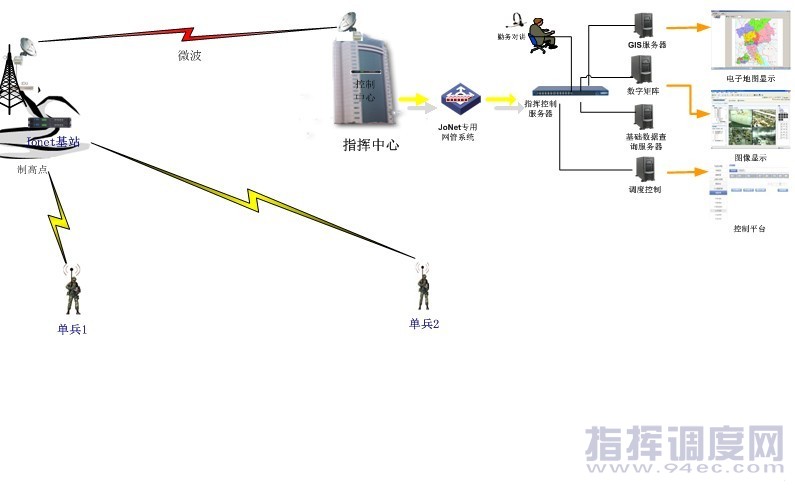 主頁(yè)(http://www.www.xzhtuan.com):久華信:某單位應(yīng)急Jonet移動(dòng)多媒體指揮系統(tǒng) 1. 概述 當(dāng)前,科技發(fā)展日新月異,我們已經(jīng)步入了信息化時(shí)代。在公安、武警、消防、人防、遠(yuǎn)程監(jiān)控等部門,實(shí)現(xiàn)信息化已經(jīng)成為一個(gè)重要的課題。本方案針對(duì)某單位多途徑、多手段、非視距條件下的實(shí)時(shí)視頻圖像監(jiān)控傳輸需求,采用以JoNet傳輸系統(tǒng)為主,配合多種通信手段,建立一個(gè)高效、穩(wěn)定、覆蓋指定地區(qū)的無(wú)線移動(dòng)圖像監(jiān)控傳輸網(wǎng)絡(luò),通過(guò)車載式圖像傳輸系統(tǒng)將監(jiān)控圖像通過(guò)無(wú)線傳輸鏈路實(shí)時(shí)傳輸至指揮中心及相應(yīng)領(lǐng)導(dǎo)機(jī)關(guān)。 整個(gè)系統(tǒng)具有機(jī)動(dòng)靈活、快速反應(yīng)的特點(diǎn),真正實(shí)現(xiàn)了高速移動(dòng)中圖像、語(yǔ)音、數(shù)據(jù)的實(shí)時(shí)、同步通信傳輸,可擔(dān)負(fù)公安、反恐、遠(yuǎn)程現(xiàn)場(chǎng)指揮、公共突發(fā)事件、搶險(xiǎn)救災(zāi)、遠(yuǎn)程監(jiān)控等遠(yuǎn)程現(xiàn)場(chǎng)多媒體信息實(shí)時(shí)、動(dòng)態(tài)的收集處理傳遞的重要任務(wù),是無(wú)線通信技術(shù)、計(jì)算機(jī)網(wǎng)絡(luò)技術(shù)和微電子技術(shù)等技術(shù)的有機(jī)結(jié)合。 同時(shí)它利用各種通信手段互相補(bǔ)充、互相結(jié)合構(gòu)成多手段、多路由的通信網(wǎng)絡(luò),充分利用JoNet傳輸系統(tǒng)組成各部門一體化通信指揮系統(tǒng),將各種遠(yuǎn)程圖像、語(yǔ)音、數(shù)據(jù)信息進(jìn)行采集,并通過(guò)移動(dòng)無(wú)線鏈路傳送到各級(jí)指揮中心,為首長(zhǎng)提供實(shí)時(shí)、準(zhǔn)確的現(xiàn)場(chǎng)情況,從而為統(tǒng)一指揮和做出正確決策提供直觀、可靠的第一手資料,真正提高各部門處理應(yīng)急事件的快速反應(yīng)、統(tǒng)一指揮、協(xié)同作戰(zhàn)能力。 2. 組網(wǎng)方案 圖-1 Jonet移動(dòng)多媒體指揮系統(tǒng)拓?fù)鋱D ![]() 從上面的拓?fù)鋱D中可以看到,整個(gè)系統(tǒng)主要由1套微波,1臺(tái)JoNet基站設(shè)備,2臺(tái)JoNet單兵設(shè)備組成。將要在高山上建設(shè)一個(gè)Jonet基站,一個(gè)指揮中心,2臺(tái)單兵,以及相關(guān)圖像處理部分及其它輔助設(shè)備等。 指揮中心采用微波與制高點(diǎn)連接;制高點(diǎn)與通信車通過(guò)頻點(diǎn)340MHz的Jonet單兵設(shè)備連接。 單兵通過(guò)JoNet設(shè)備搭建的無(wú)線鏈路和基站進(jìn)行圖像、語(yǔ)音、寬帶數(shù)據(jù)互傳,基站再通微波傳到上級(jí)指揮中心。 3.1 JoNet車載移動(dòng)無(wú)線指揮系統(tǒng) 為完成對(duì)指定區(qū)域的無(wú)線圖像傳輸和覆蓋的要求,考慮采用1臺(tái)JoNet基站設(shè)備和2臺(tái)單兵設(shè)備完成對(duì)指定區(qū)域的無(wú)線圖像覆蓋。 無(wú)線圖傳系統(tǒng)設(shè)計(jì)初始所有通信車采用同一頻點(diǎn)f1,當(dāng)多臺(tái)接入基站時(shí),系統(tǒng)采用自動(dòng)接入、分配鏈路帶寬模式,完成自動(dòng)組網(wǎng)功能。 主要配置: ? JoNet基站主設(shè)備:發(fā)射功率4W,10.2dBi玻璃鋼全向天線; ? JoNet單兵站:發(fā)射功率4W,5.5dBi鞭狀全向天線; ? 設(shè)備頻點(diǎn):300-800MHz可調(diào)。 主要功能: ? 單兵和基站可進(jìn)行單向圖像、雙向語(yǔ)音、數(shù)據(jù)傳送; ? 多臺(tái)單兵可以同時(shí)無(wú)線接入1個(gè)基站; ? 視頻壓縮采用MPEG2或H.264; ? 單兵可將DV所拍的現(xiàn)場(chǎng)圖像實(shí)時(shí)傳送到基站,基站通過(guò)微波鏈路把現(xiàn)場(chǎng)圖像及語(yǔ)音傳輸?shù)街笓]中心。如圖-2: ![]() 圖-2 車載無(wú)線圖像傳輸系統(tǒng)網(wǎng)絡(luò)拓?fù)浣Y(jié)構(gòu)圖 (中國(guó)集群通信網(wǎng) | 責(zé)任編輯:陳曉亮) |