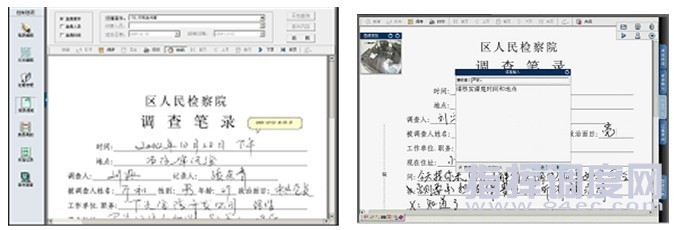 遠(yuǎn)程資料調(diào)閱 遠(yuǎn)程文字指揮 具有視聽證據(jù)等資料視頻疊加功能 系統(tǒng)的溫濕度采集技術(shù),將訊問環(huán)境的溫、濕度及時(shí)間以O(shè)SD方式同步疊加于視頻畫面上。 可將辦案地點(diǎn)、卷宗、被訊問人、訊問人等光盤片頭內(nèi)容即時(shí)疊加于視頻畫面上,且支持視頻片頭顯示時(shí)間設(shè)定,并在播放錄像時(shí)也顯示。 支持多種審訊方式 兼容聯(lián)合審訊、交叉審訊、對(duì)比審訊等檢察機(jī)關(guān)常用的訊問方式,貼近辦案實(shí)際。