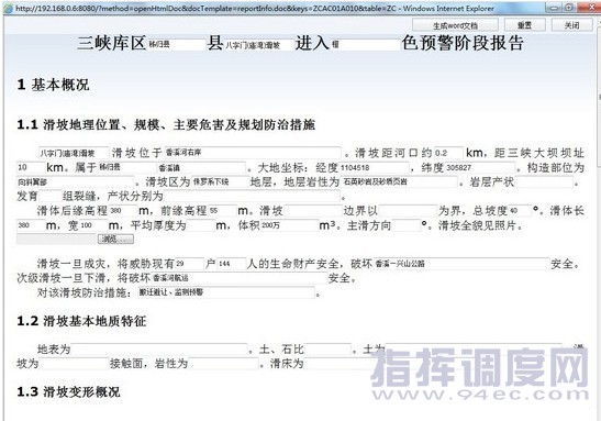 3.2利用自定義模板輔助生成報(bào)告 系統(tǒng)內(nèi)置報(bào)告生成模版,災(zāi)害點(diǎn)基本信息可直接從庫中讀取、報(bào)告內(nèi)容可在網(wǎng)頁上根據(jù)模版設(shè)置直接輸入,通過報(bào)告輔助生成模式直接產(chǎn)生圖文并茂的OFFICE報(bào)告文檔,可直接在網(wǎng)頁上在線編輯OFFICE報(bào)告文檔并保存。支持核查報(bào)告、會(huì)商報(bào)告、應(yīng)急預(yù)案在線輔助生成。