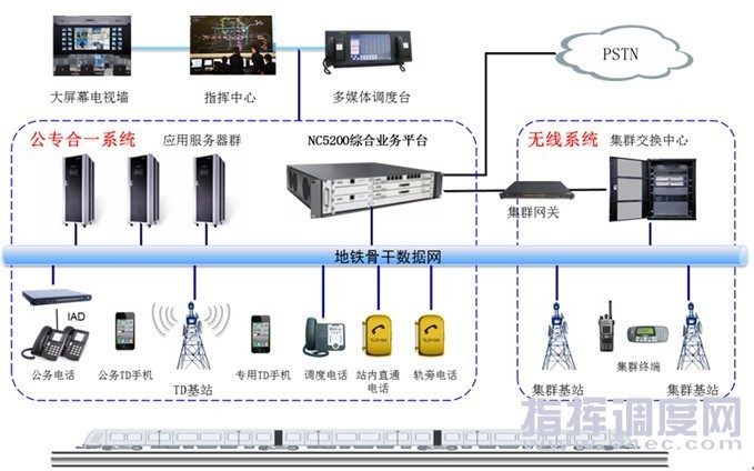 方案背景: 在軌道交通通信系統(tǒng)中,公務(wù)電話系統(tǒng)主要用于地鐵內(nèi)部各部門、地鐵用戶與公網(wǎng)用戶之間的電話聯(lián)系,為線路的運營、管理、維修等部門的工作人員提供服務(wù);專用電話系統(tǒng)是調(diào)度員和車站、車輛段值班員指揮列車運行和下達調(diào)度命令的重要通信工具,是為列車運營、電力供應(yīng)、日常維修、防災(zāi)救護、票務(wù)管理提供指揮手段的專用通信系統(tǒng)。在提供的業(yè)務(wù)上,兩者之間沒有任何聯(lián)系,因此在軌道交通通信系統(tǒng)中兩個系統(tǒng)一般是分開設(shè)置的獨立運行。但是,由于公務(wù)電話系統(tǒng)和專用電話系統(tǒng)均是以電話交換機為基礎(chǔ),因此完全可以通過優(yōu)化系統(tǒng)方案,在保證公務(wù)電話系統(tǒng)和專用電話系統(tǒng)可靠性和獨立性的基礎(chǔ)上,實現(xiàn)二者的融合。