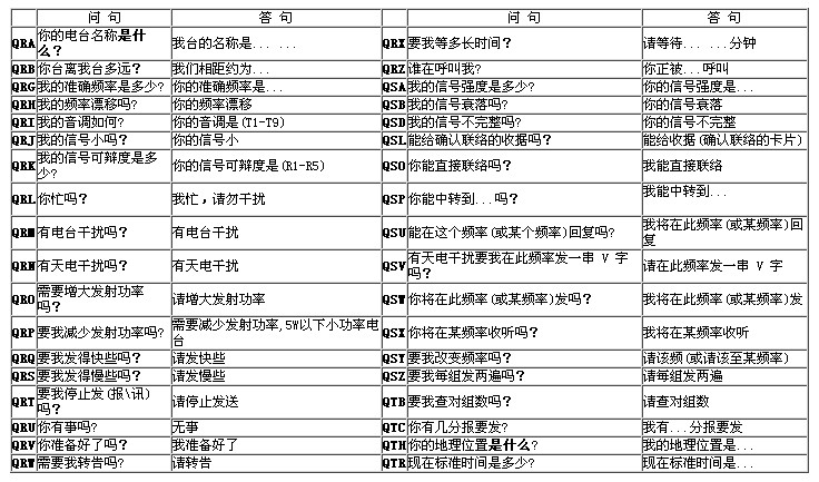 國際電訊聯(lián)盟(ITU)頒布了通信用簡語。每個簡語由三個字母組成并代表一個完整的意思,由于第一個字母都是 Q ,所以稱為 Q 簡語。在通信聯(lián)絡(luò)中,Q 簡語可以作問句,如“QRL?”(你忙嗎?);也可以作答句,如“ QRL ”(我很忙,請勿打擾);也可以單獨使用,如“QRT”(停止發(fā)射,關(guān)機);也可以和其他單詞一起使用,如“SRI MUST QRT NW”(對不起,現(xiàn)在我很忙,必須立即關(guān)機)。Q 簡語的使用,大大縮短了通信時間,提高了通信效率。